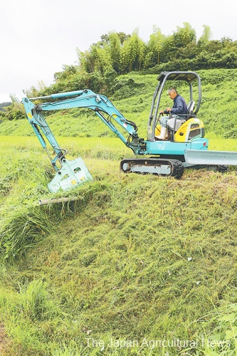 Hida, who manages 8 hectares of farmland in a mountainous area where rice fields spread along mountain slopes, operates excavators to weed grass on the ridges as well as crushing bamboo and other plants protruding farm roads.