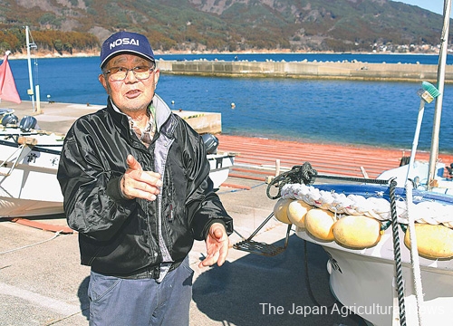 Hayashi is a fruit farmer who also makes his living from sea cucumber fishing. (In Higashi Matsushima City, Miyagi Prefecture)