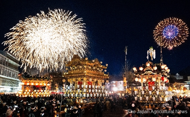 The six massive floats gather in front of the city hall in Chichibu, Saitama Prefecture, and fireworks are launched as the Chichibu Yomatsuri night festival comes to an end.